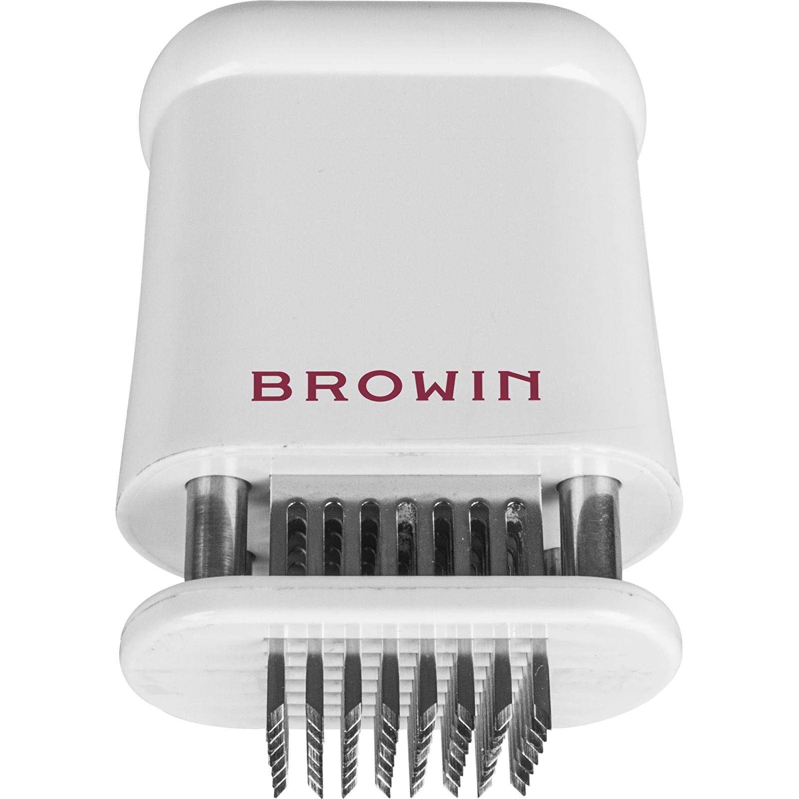 Sikkerheden er tænkt ind i alle detaljer: De 56 knive er skjult bag en beskyttelseskappe og skydes kun ud, når værktøjet presses mod kødet. Når du er færdig, kan du låse knivene permanent, så den kan ligge sikkert i skuffen uden risiko for snitsår.