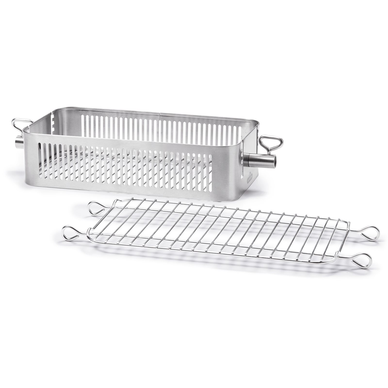 Hvor den klassiske tromleformede kurv lader maden "tumble" rundt, er denne flade kurv skabt til at fiksere dine råvarer. Ved at klemme maden skånsomt fast, opnår du den fantastiske roterende tilberedning, der bevarer saften inde i kødet, uden at ødelægge råvarens form eller struktur.